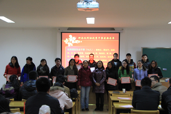 大会最后一项内容为颁奖,戴书记、赵老师分别为2013年度水电院参加金水节闭幕式晚会表演的同学、优秀班长和党支书、研会和科协优秀干部及干事进行颁奖。最后,戴书记、赵老师和获得荣誉的同学合影留念。
