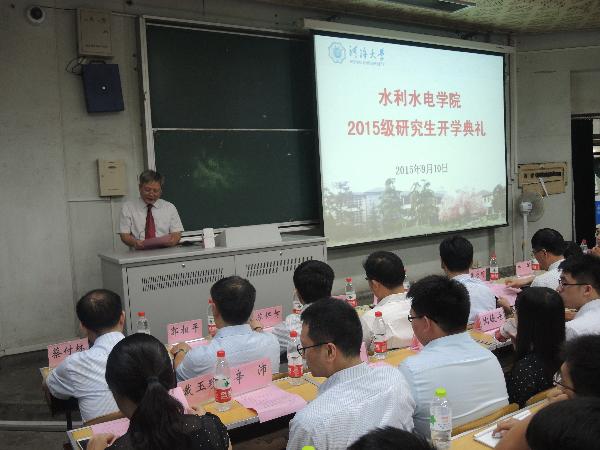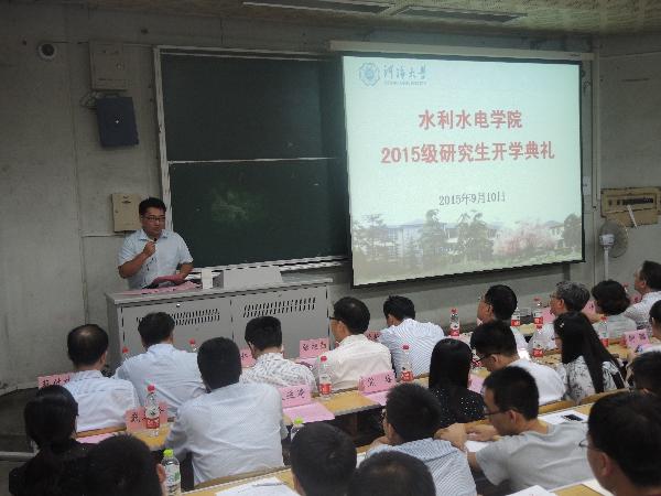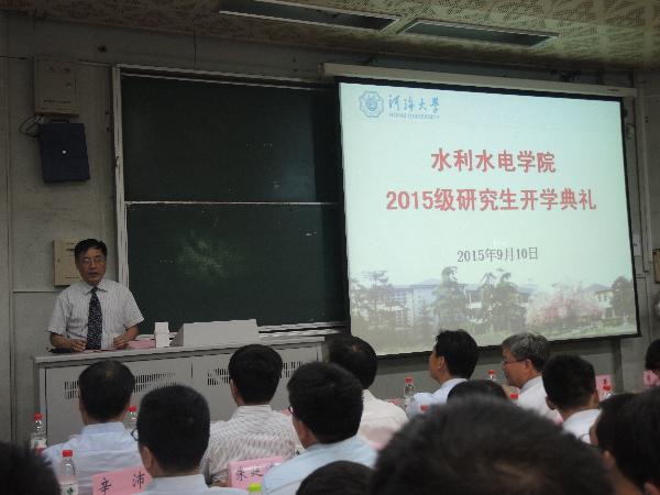 顾冲时院长代表水电院向全体入学新生表示衷心的祝贺和热烈的欢迎,希望每位同学一如既往地刻苦学习,鼓励大家弄潮科学前沿,争做创新人才;强调同学们在进行科研的过程中必须恪守科学道德,保持严谨学风。顾院长还指出,作为一名研究生,既要敢于竞争,更要善于合作,因为科学研究、自主创新只有通过科技群体的共同努力才能够取得大成果,最终到达科学事业的顶峰;最后顾院长鼓励同学们,克服种种困难,坚持梦想,潜心学术,度过一段充实而有挑战性的研究生时光。