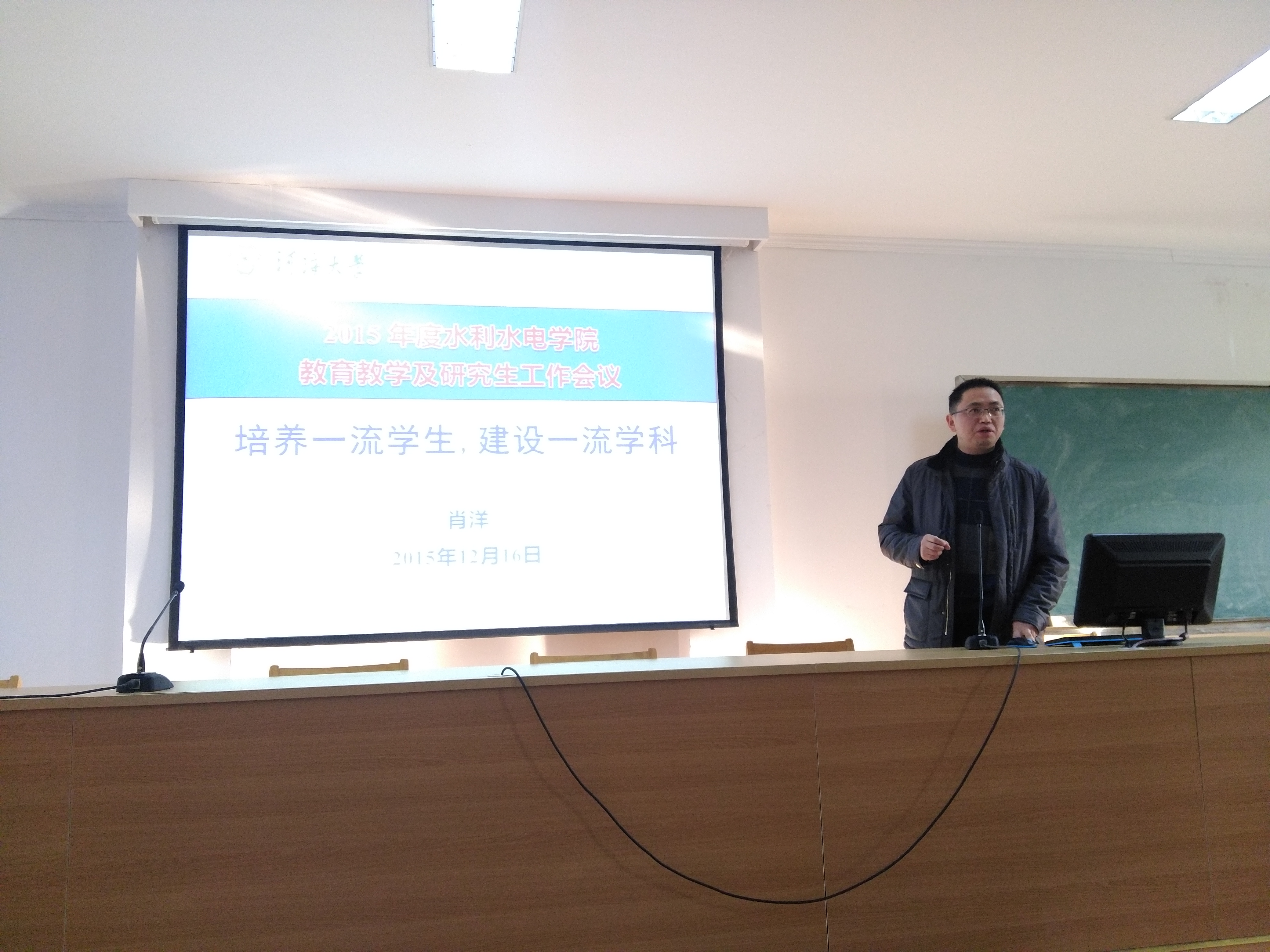 12月16日下午,学院于水电馆401召开“2015年度教育教学及研究生工作会议”,会议由张展羽书记主持。本次会议特邀教务处胡明副处长到场指导,参加会议的还有学院二级机构正副主任、所长,本科生和研究生教学、教育管理人员,青年教授代表,核心课程负责人,各系所代表,实验中心教师代表,教学秘书,辅导员及优秀学生代表等。为紧密契合今年学校教育教学工作重点,学院此次会议的主题为“双一流•国际化”。