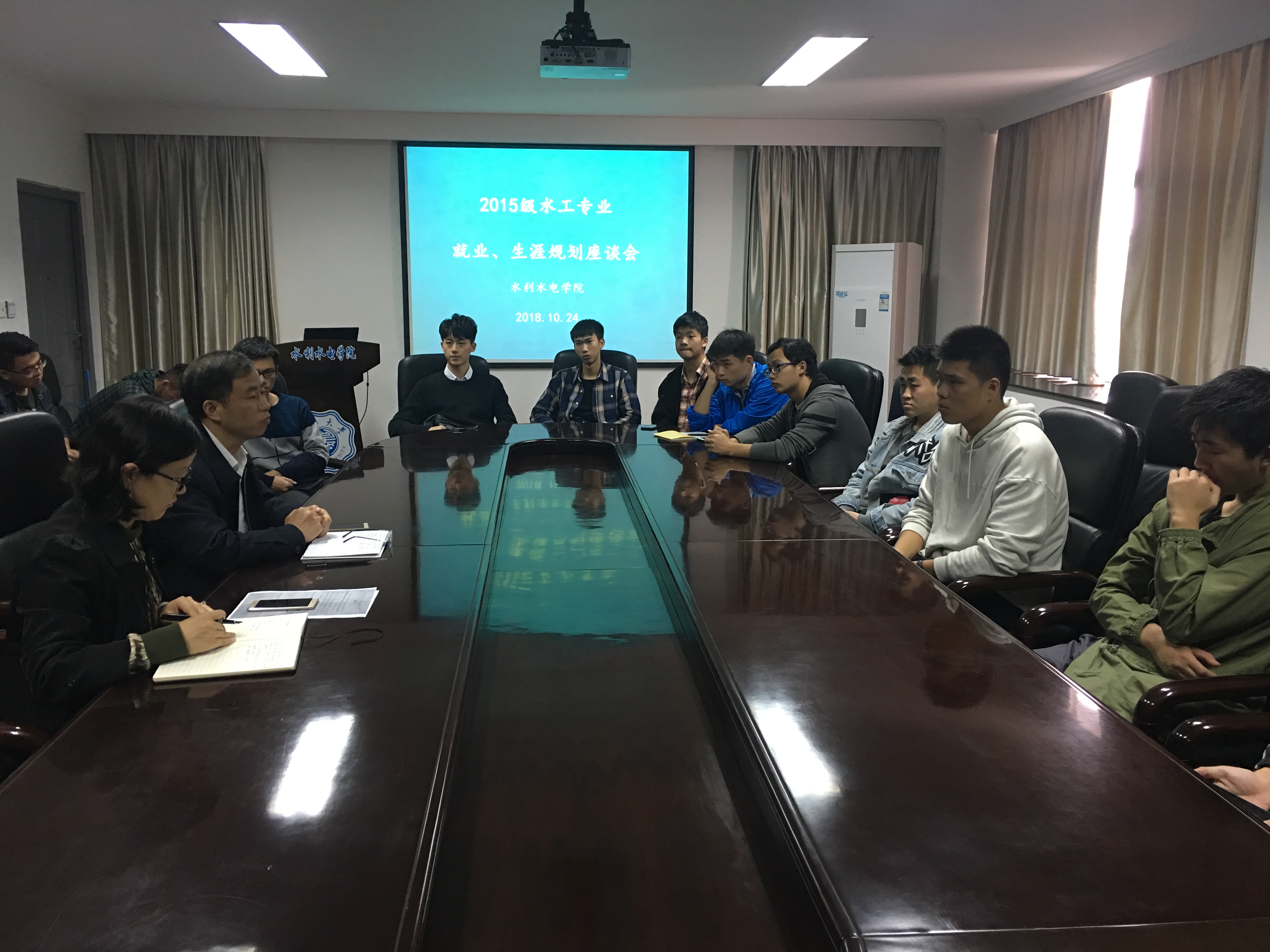 院党委戴玉珍副书记首先了解了学生代表目前就业和考研状态,指导考研学生不要盲目追求热门专业或热门学校,要结合自身复习情况。对于想要就业的学生,戴玉珍副书记从就业形势、就业政策、就业方向等方面进行指导,为水工专业同学指明方向。水利水电工程系主任蔡付林教授主要从学业要求、学习方法等方面再次强调,提醒学生自查目前所缺学分,保证顺利毕业,并对学有困难的学生进行开导,鼓励大家要有勇气克服困难。