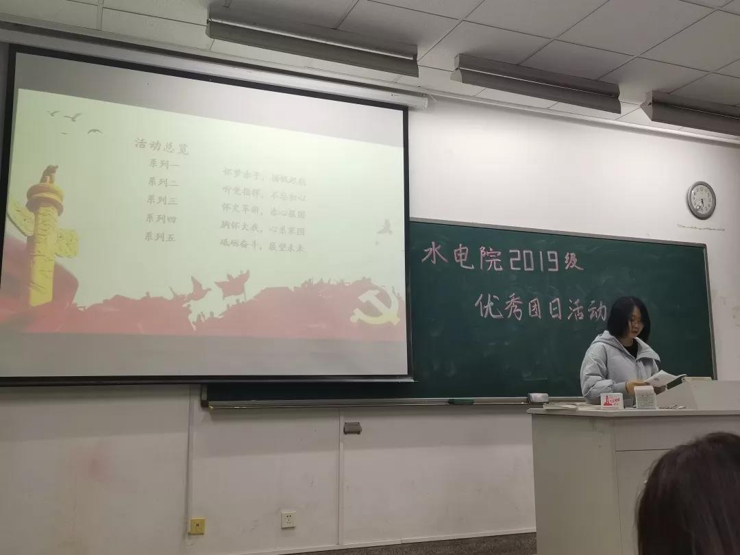 接下来,是由四班团支书章红同学进行陈述。丰富的活动图片与详尽的文字介绍是她宣讲时的特色,透过她的宣讲,台下观众感受到是一个充满活力,乐观开放的水工四班。 接着章红同学的是五班团支书胡昱琳同学,她为台下同学们条理清晰地罗列出水工五班在过去的100天里所进行的一系列团日活动,展现出五班同学饱满的精神风貌与端正的行为作风。最后由三班团支书易旻旻就三班团日活动进行陈述。以三班志愿活和学生素质发展为特色为团日活动特色,她向观众们展现出三班同学互相关爱,乐于助人的精神品质,让观众们共同认识到一个友爱互助的三班。