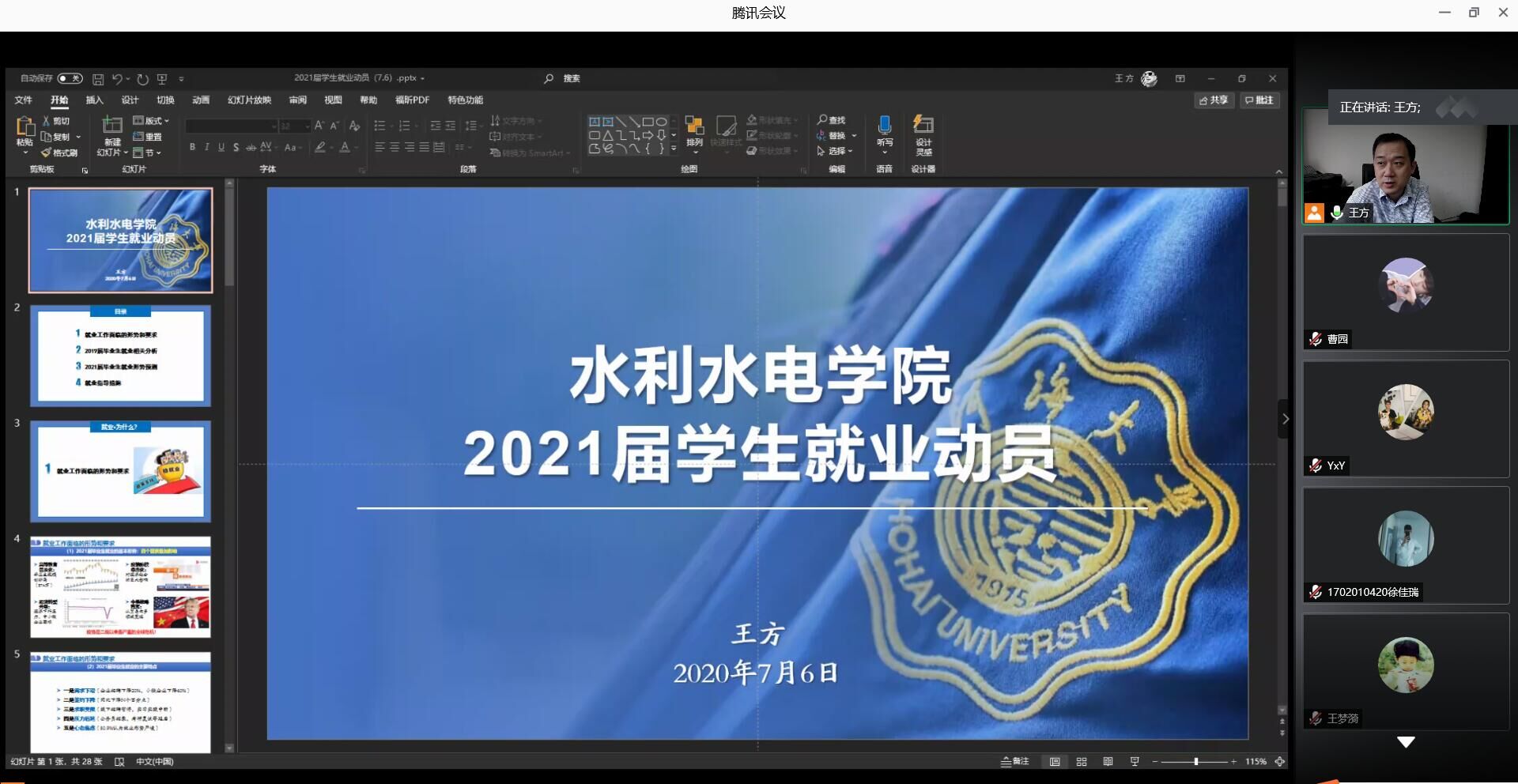 王方副书记介绍了当前就业工作面临的形势和要求,分析了20192020届毕业生就业情况。他强调,行动迟缓是大学生就业存在的突出问题,2021届毕业生应尽早明确生涯发展目标,规划就业方向,认清当前形势,调整就业期待,提前做好准备。王方副书记寄语全体学生以高标准严格要求自己,在暑期合理规划时间,安排学习计划,迎接新学期的到来。