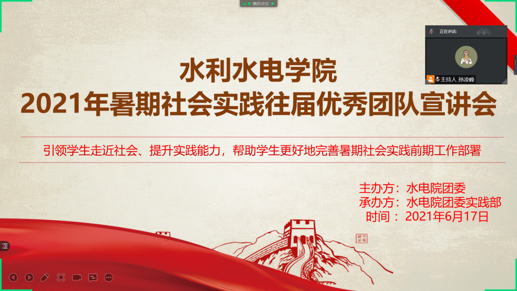 为加深同学们对实践具体过程的了解,帮助学生更好地完善暑期社会实践前期工作部署,色漫 团委实践部于2021年6月17日下午16:00在腾讯会议上举办了色漫 2021年暑期社会实践往届优秀团队宣讲会。本次活动邀请到3支往届优秀实践团队,分别来自不同项目类型,可以让同学们更好地了解不同项目类型的实践活动如何更好的开展。
