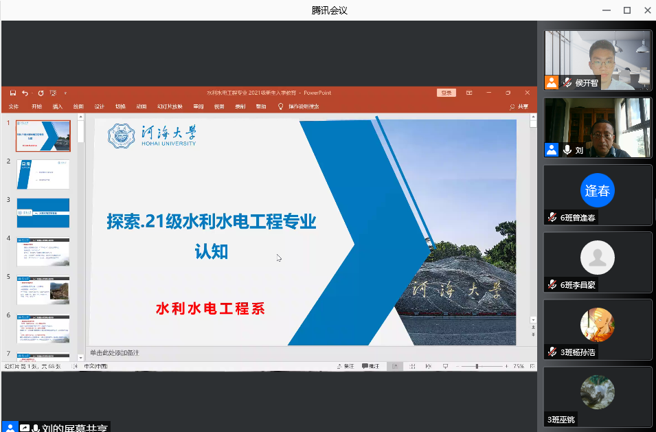 12日上午,2021级扬帆·大学生涯起航周活动之“探索·21级水工专业认知”线上专业教育会如期举行,水利水电工程系系主任刘永强、2021级全体同学以及辅导员侯开智参加会议。刘永强详细介绍了水工专业本科生培养方案及专业未来发展方向,希望同学们学好专业基础,努力提高自己的创新能力,为将来成为一名合格的水利工作者打下坚实基础。