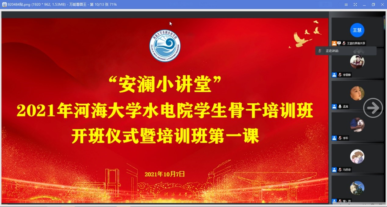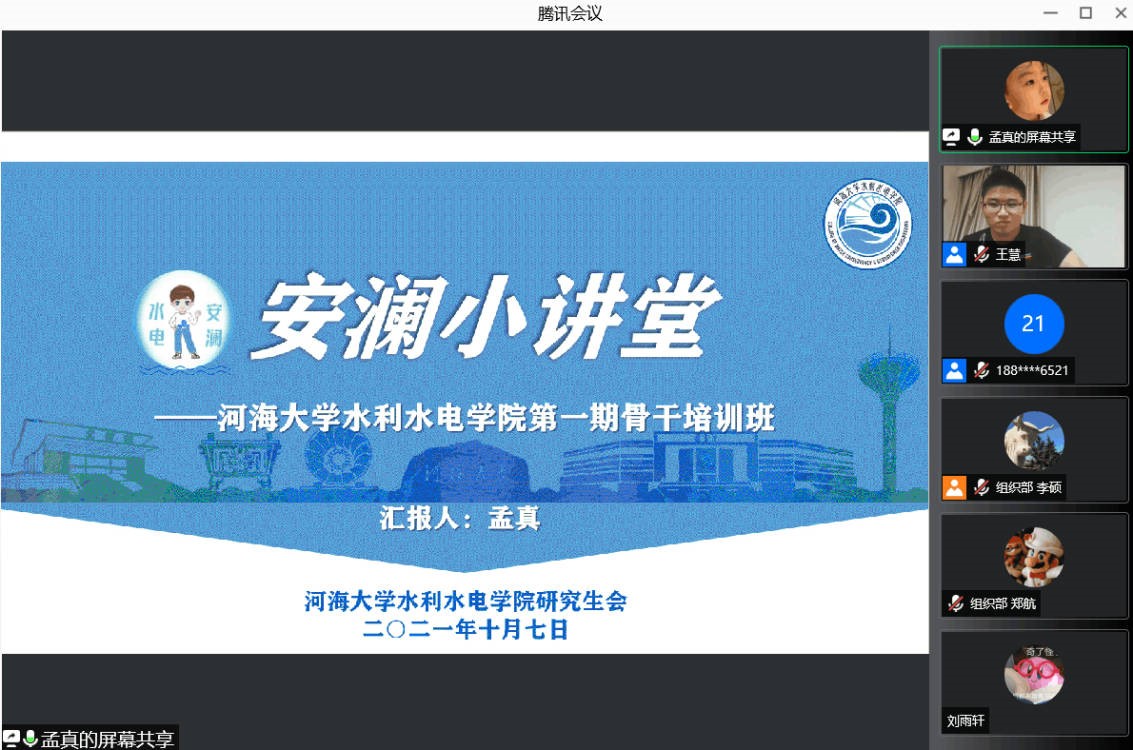 10月7日,“安澜小讲堂”——2021年色漫 水电院学生骨干培训班开班仪式暨培训班第一课在线上召开。色漫 研究生会主席团成员金子又、色漫 水电院研究生会主席易正元、副主席高阳、冯思奇及部长团成员出席本次培训,水电院第十九届研究生会全体成员及第二十四届学生会部分成员参与本次活动,活动由秘书处王慧主持。