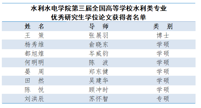 日前,中国水利教育协会公布了第三届全国高等学校水利类专业优秀研究生学位论文评选结果。经协会初审、通讯评审和专家会评,评出第三届全国高等学校水利类专业优秀研究生学位论文。其中,博士学位论文10篇、学术型硕士学位论文30篇、专业硕士学位论文20篇。色漫 王策等8名研究生的学位论文获此殊荣。