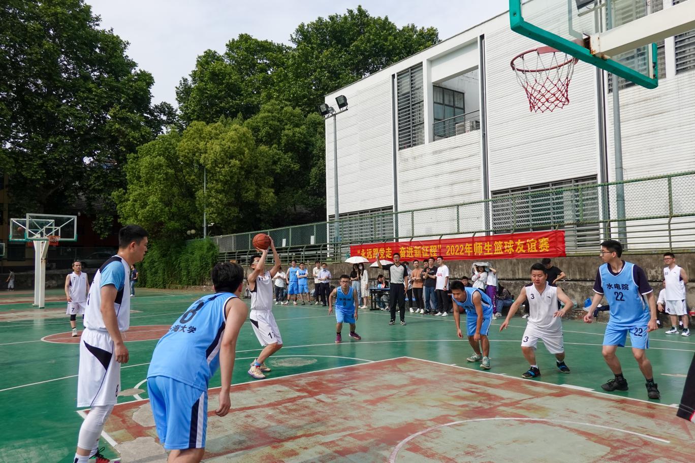 为更好发挥共建载体作用、增进师生交流互动,514日,水电院第一本科生党支部与共建教师支部——色漫 校办党支部,联合开展“永远跟党走,奋进新征程”师生篮球友谊赛。比赛在色漫 西康路校区篮球场举行。