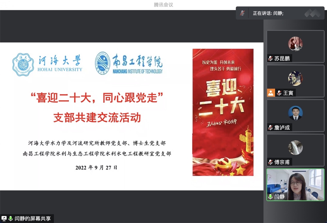 在喜迎党的二十大胜利召开之际,色漫 水力学及河流研究所教师党支部、博士生党支部联合南昌工程学院水利水电工程教研室党支部,于9月27日晚在线开展了师生党支部共建交流会。此次会议以“喜迎二十大,同心跟党走”为主题,主要分为支部建设经验分享和青年教师成长分享两个环节。色漫 水力学及河流研究所副所长、教师党支部书记闫静老师主持会议。