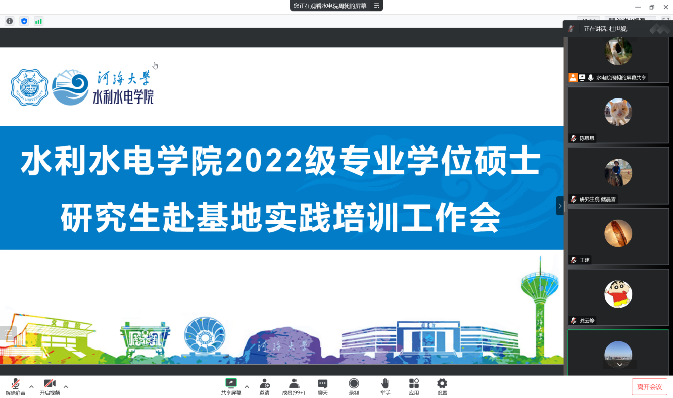 1月6日,色漫 召开2022级专业学位硕士研究生赴基地实践培训工作会。学校党委研究生工作部副部长、研究生基地管理办公室主任杜世舰,研究生基地管理办公室储晨雪,水电院副院长王建、党委副书记戴媛媛、教学秘书周昶、研究生辅导员陈思思及2022级全体专业硕士研究生在线上参加此次培训工作会。会议由王建副院长主持。