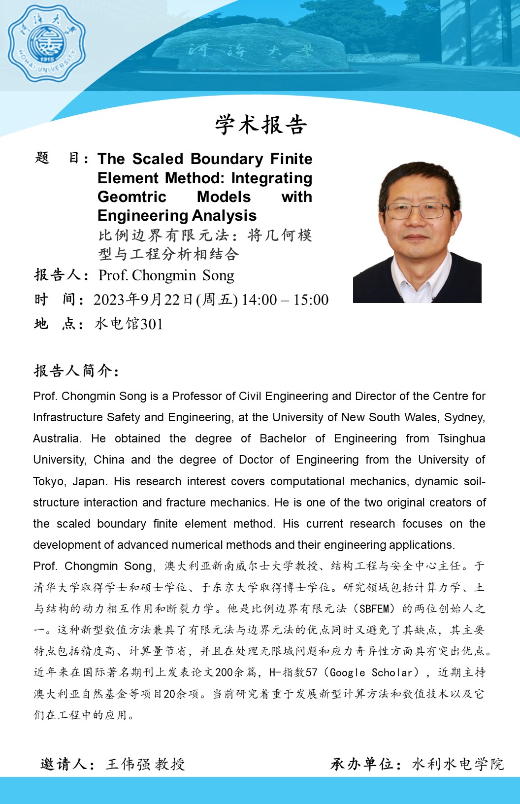 报告题目:The Scaled Boundary Finite Element Method: Integrating Geomtric Models with Engineering Analysis