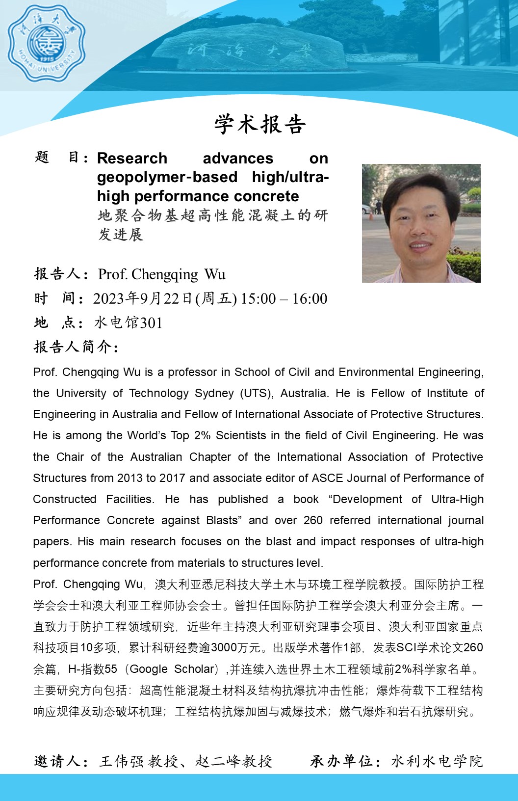 Prof. Chengqing Wu,悉尼科技大学土木与环境工程学院教授。国际防护工程学会会士和澳大利亚工程师协会会士。曾担任国际防护工程学会澳大利亚分会主席。一直致力于防护工程领域研究,近些年主持澳大利亚研究理事会项目、澳大利亚国家重点科技项目10多项,累计科研经费逾3000万元。出版学术著作1部,发表SCI学术论文260余篇,H-指数55(Google Scholar)。连续入选土木工程领域世界前2%科学家名单。主要研究方向包括:超高性能混凝土材料及结构抗爆抗冲击性能;爆炸荷载下工程结构响应规律及动态破坏机理;工程结构抗爆加固与减爆技术;燃气爆炸和岩石抗爆研究。