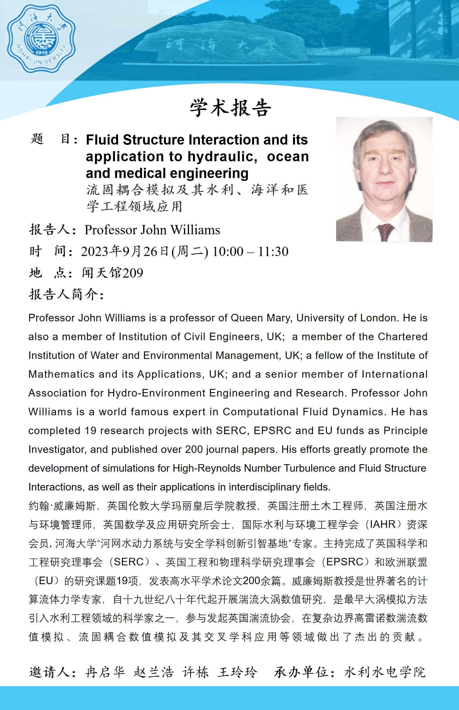 约翰·威廉姆斯,英国伦敦大学玛丽皇后学院教授,英国注册土木工程师,英国注册水与环境管理师,英国数学及应用研究所会士,国际水利与环境工程学会(IAHR)资深会员,色漫 “河网水动力系统与安全学科创新引智基地”专家。主持完成了英国科学和工程研究理事会(SERC)、英国工程和物理科学研究理事会(EPSRC)和欧洲联盟(EU)的研究课题19项,发表高水平学术论文200余篇。威廉姆斯教授是世界著名的计算流体力学专家,自十九世纪八十年代起开展湍流大涡数值研究,是最早大涡模拟方法引入水利工程领域的科学家之一,参与发起英国湍流协会,在复杂边界高雷诺数湍流数值模拟、流固耦合数值模拟及其交叉学科应用等领域做出了杰出的贡献。