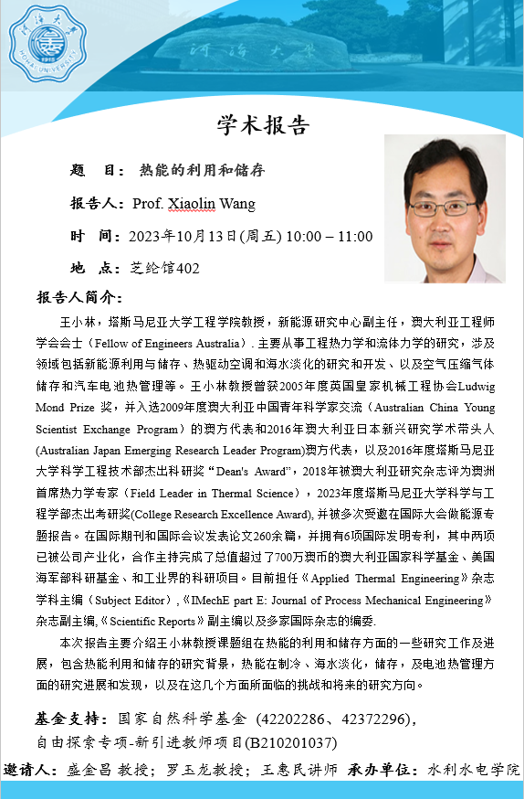Prof. Xiaolin Wang,塔斯马尼亚大学教授。在国际主流期刊发表260余篇SCI论文,合作主持完成了总值超过了700万澳币的科研项目。本次报告主要介绍王小林教授课题组在热能的利用和储存方面的一些研究工作及进展,包含热能利用和储存的研究背景,热能在制冷、海水淡化,储存,及电池热管理方面的研究进展和发现,以及在这几个方面所面临的挑战和将来的研究方向。