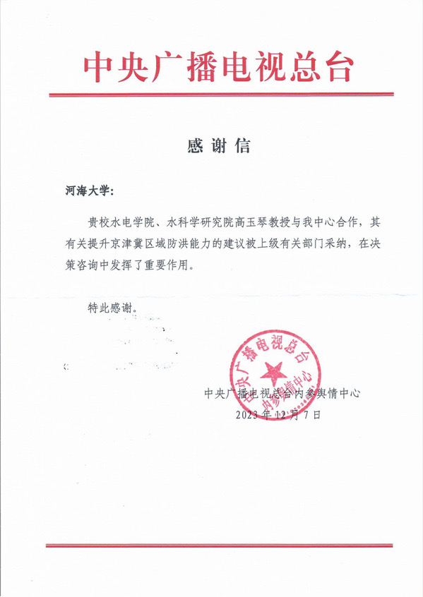 色漫 长三角洪涝旱灾害防御研究室主任高玉琴教授接受了中央广播电视总台内参舆情中心的采访,谈论了蓄滞洪区建设平原型水库的注意点及提升京津冀地区防洪能力的建议,被上级有关部门采纳,为决策咨询提供了重要的技术支撑。