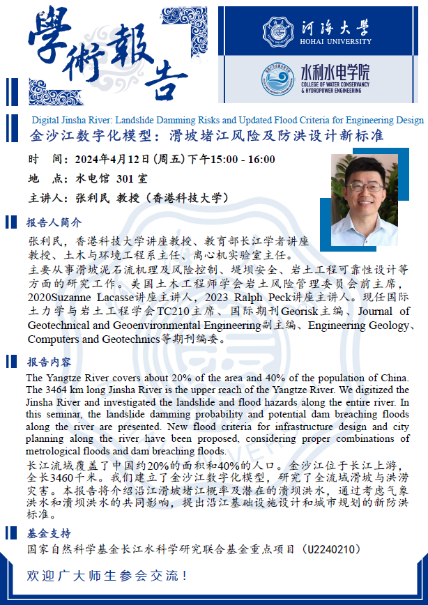 学术报告| 金沙江数字化模型:滑坡堵江风险及防洪设计新标准(报告人:香港科技大学 张利民 教授)
