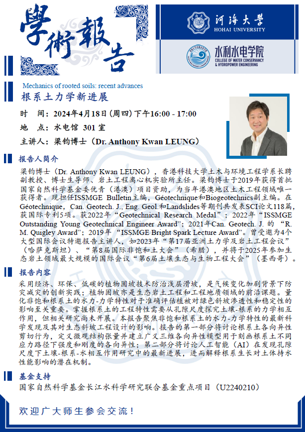 学术报告 | Mechanics of rooted soils: recent advances 根系土力学新进展 (报告人:香港科技大学 梁钧 副教授)