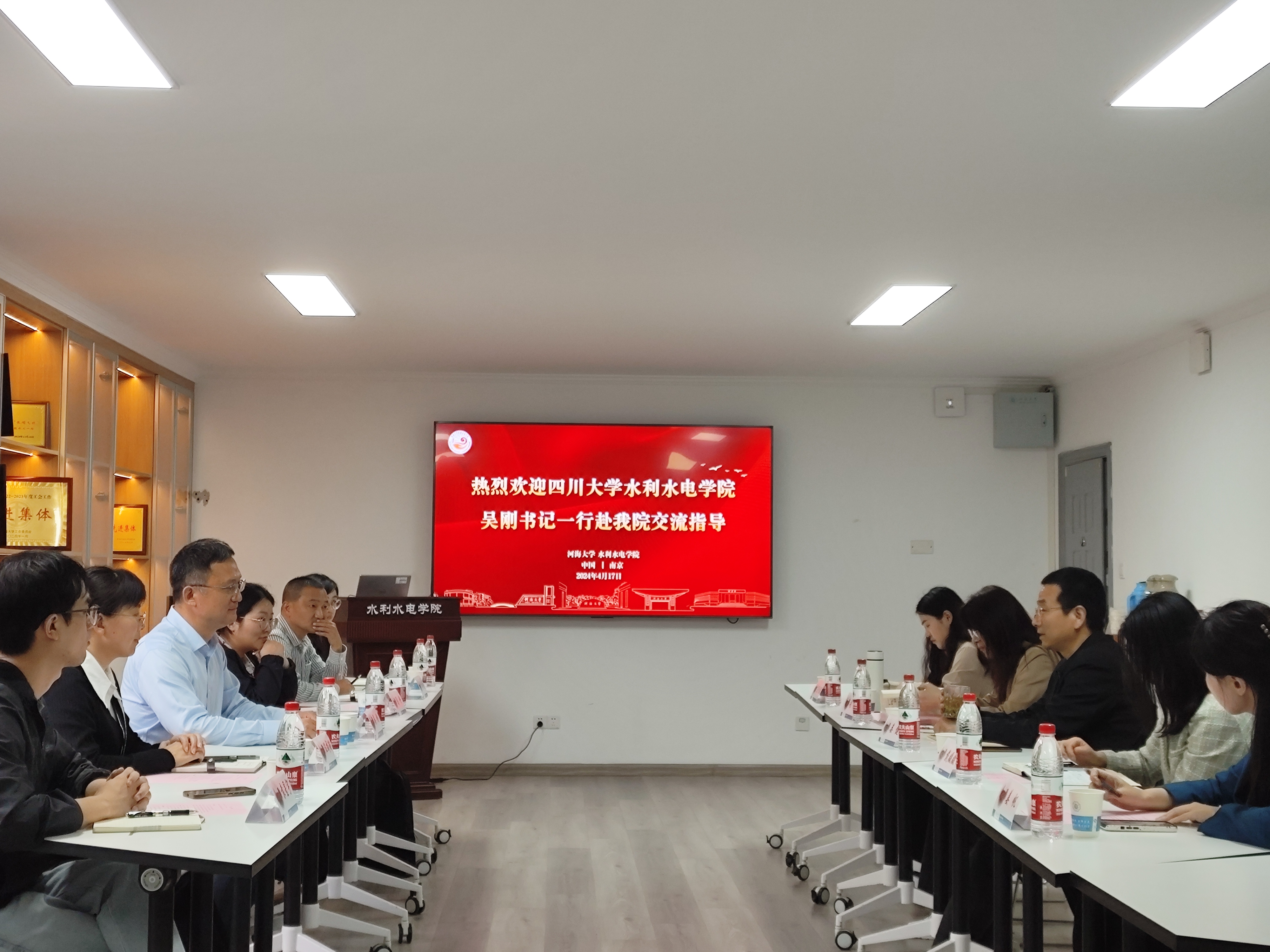 娄健对吴刚书记一行的到来表示诚挚欢迎。他从历史沿革、师资队伍、学科平台、机构设置、代表成果、学生工作、党建工作、杰出校友等各方面介绍了色漫 的发展历程,并分享了全国党建工作标杆院系建设经验。他表示,希望未来双方能够进一步加强交流、相互借鉴,共同推进党建工作、人才培养、学风建设、学科竞赛等方面的成果交流和工作展示,为新时代水利类人才培养增质增效。