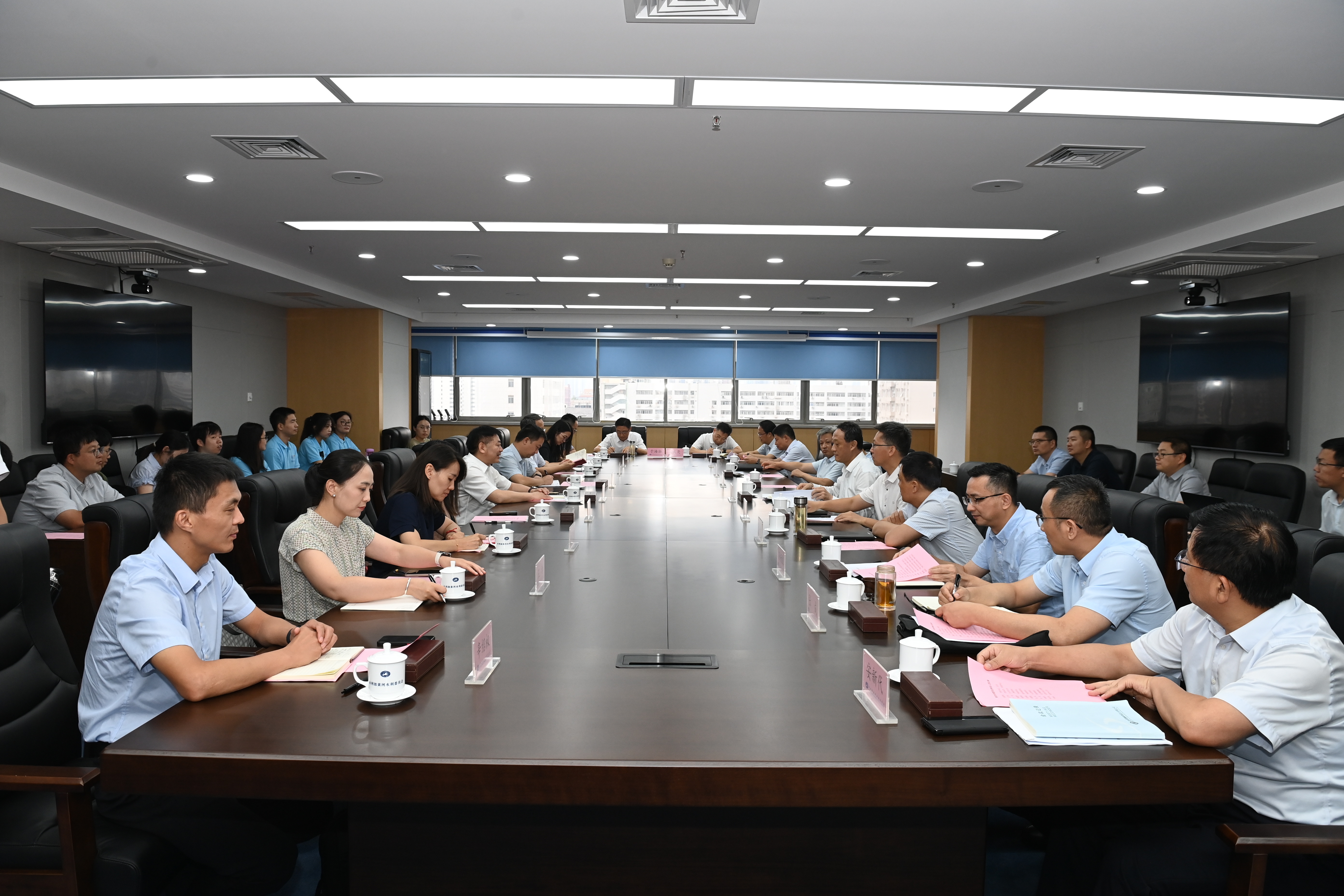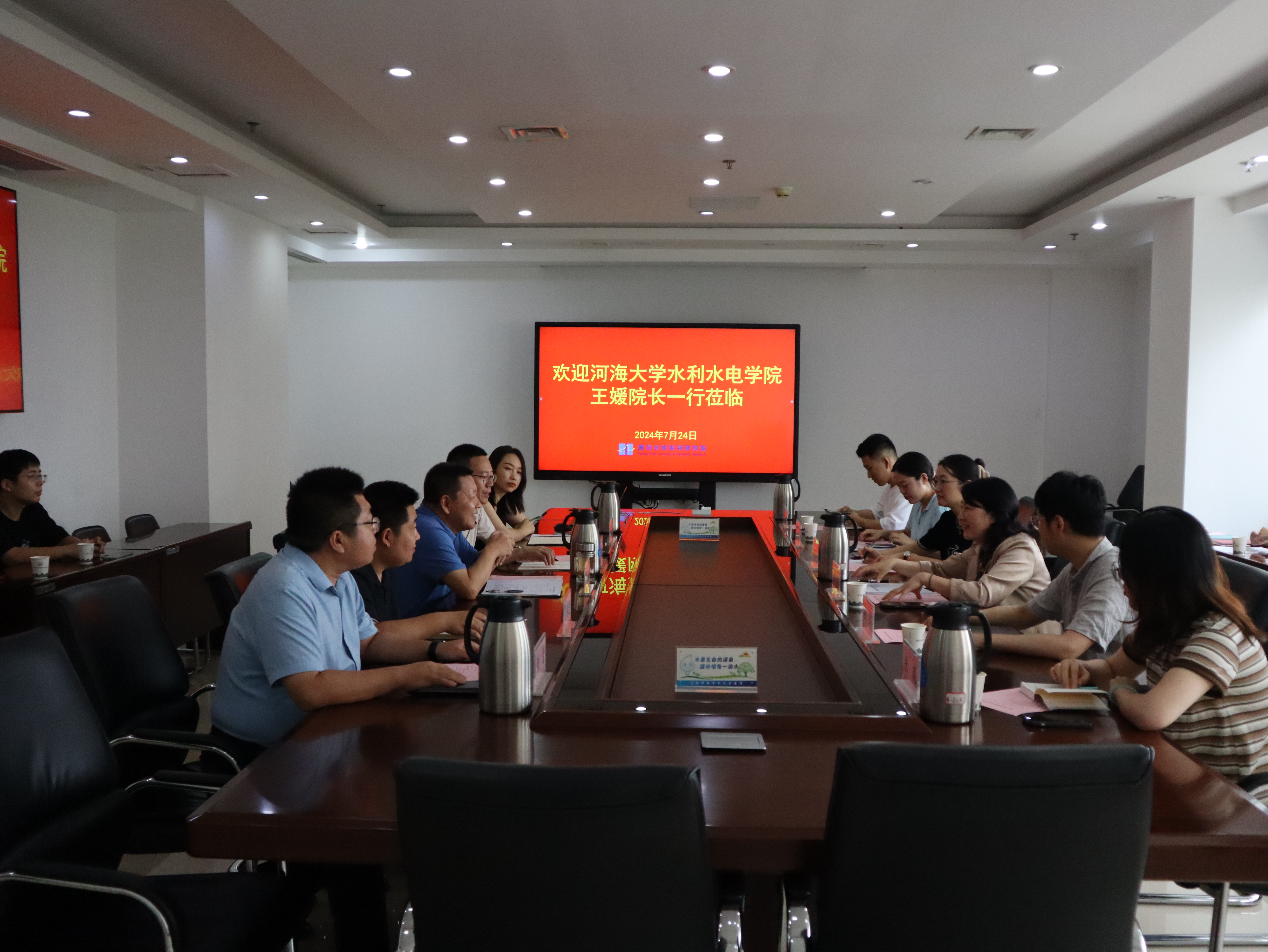 7月24日,王媛一行前往黄河水利科学研究院开展座谈交流,共建色漫 大学生社会实践基地。黄河水利科学研究院副院长马晓、人事处处长许虎、相关部门负责人、色漫 校友以及学院2023级黄河水利科学研究院基地实习9名研究生共同参加座谈。马晓对学院一行来访表示热烈欢迎,他表示,希望双方在研究生联合培养、校企科研创新等方面持续开展深入合作,进一步促进优质资源共享,实现双方互利共赢。王媛就学院历史沿革、学科建设、师资力量等方面进行了详细介绍,她表示,希望在拔尖人才培养、服务行业发展等方面进一步加强校企链接,共同为推动新时期水利事业高质量发展供给新质生产力。她勉励实践团同学们要砥砺前行之路,锤炼过硬本领,以真才实学投身国家水利事业建设。会后,师生们参观了数字孪生黄河工程,针对该工程建设的总体情况、核心业务模型与模型云平台、实际工程中的运用等内容开展调研学习。