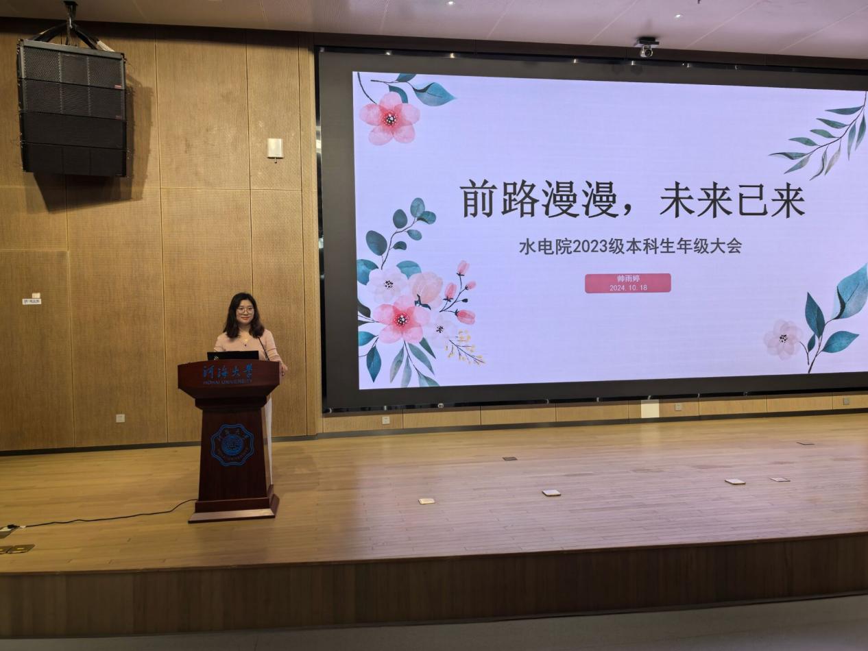 帅老师首先对“我们的现在”展开学情分析,针对专业平均情况和各班级情况进行逐一解析,鼓励目前领先的同学不忘初心,继续前行,也鞭策稍有落后的同学打起精神,奋起直追。同时,她表扬了大一学年获得各项学科竞赛奖项及荣誉的同学,并以此激励其余同学,敢于争先,勇于争先。帅老师就“我们的底线”进行毕业须知提醒。从培养方案着手,帅老师提醒同学们关注自己的系统,进行学分自查;从两证获取说起,帅老师警醒同学们诚信考试,不违纪不作弊,积极关注自己的课程重修补修情况。未来已来,帅老师强调了“我们的追求”,对同学们未来的发展进行分类规划。帅老师将本科毕业后的去向分为就业篇和升学篇,在就业篇里列出水电学子能参加的各项岗位并逐一介绍,在升学篇里面向保研、考研和境外升学做不同的提醒,扫去了同学们心中对未来的迷茫。