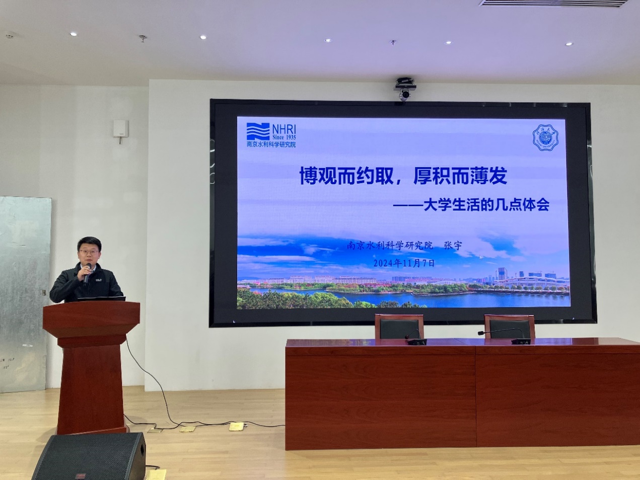 企业导师、南京水利科学研究院张宇结合自身工作经历,从三个维度,为同学们深入浅出地分析了水利行业。首先,他强调了坚决树立行业自信的重要性。“治水即治国,治水之道是重要的治国之道”,张宇老师指出,水电行业具有广阔的发展前景和无限的潜力,鼓励同学们要坚定信念,相信自己所选择的专业道路,并为之努力奋斗。接着,张宇提到大学是人生的黄金学习期,同学们不仅要深耕专业知识,更要注重提升综合素质和创新能力,通过参与科研项目、社会实践等活动,为职业生涯奠定坚实基础。张宇着重强调了提前规划职业生涯的必要性。他指出,职业规划是一个长期而复杂的过程,需要同学们根据自己的兴趣、特长,结合行业发展趋势和市场需求,制定切实可行的职业规划方案。同时,可以适当寻求学长学姐的帮助,了解单位实际情况,避免盲目跟风,在激烈的职场竞争中占据有利地位。
