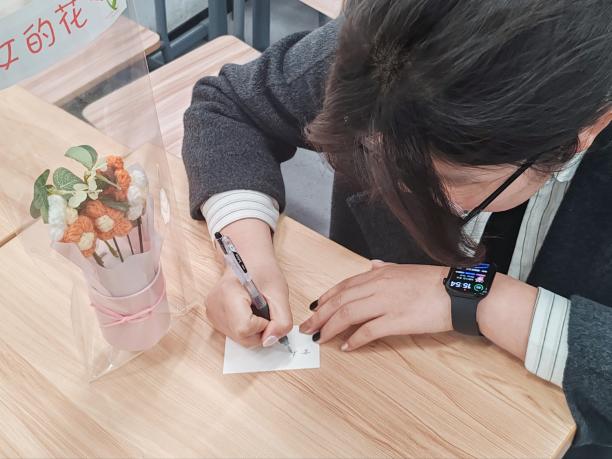 班级团支书苏月萌向同学们讲解国际劳动妇女节的由来、发展,并分享克拉拉·蔡特金、何香凝等妇女运动领袖的事迹,展现了一代代女性在争取权利、参与斗争的光荣事迹和独立精神。班级同学每人制作一份钩织花礼物,在贺卡上写下“妇女节快乐!”“祝您自豪、自信、自由!”等祝福语,并将礼物送给宿管阿姨、任教老师作为祝福,以此表达对劳动妇女的感谢和敬重。