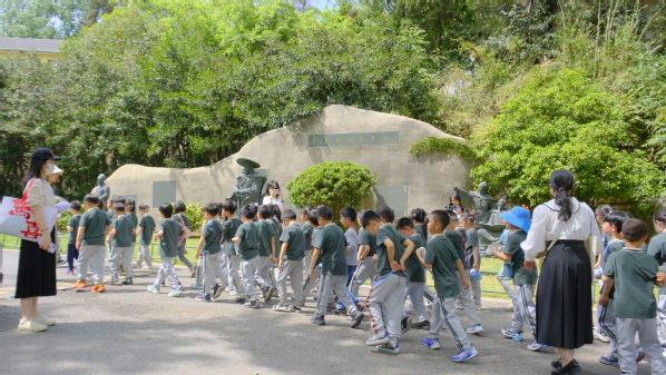 下午1点,力学小学师生一行抵达色漫 1号门。志愿者围绕校门的历史演变及篆刻有“色漫 ”字样的泰山石进行了详细讲解,引导小朋友们从字迹风格和校门变迁中感悟色漫 砥砺奋进的风雨历程。
