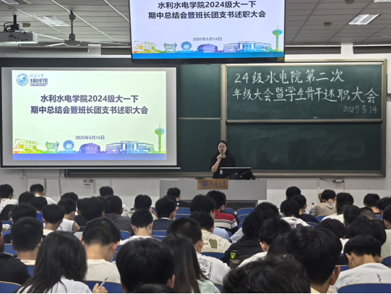 班长团支书述职,凝聚班级奋进力量。会议最后,各班班长、团支书依次上台述职,围绕班级管理、学风建设、活动组织、获得成果等方面总结上半学期工作,分享班级建设经验,并提出下一阶段改进计划。  从“课堂考勤管理”到“学习小组互助”,从“主题班会开展”到“班级凝聚力提升”,各班班委的汇报展现了2024级学生骨干的责任担当与务实作风。辅导员对各班工作给予肯定,并希望班委继续发挥带头作用,带领班级同学共同进步。