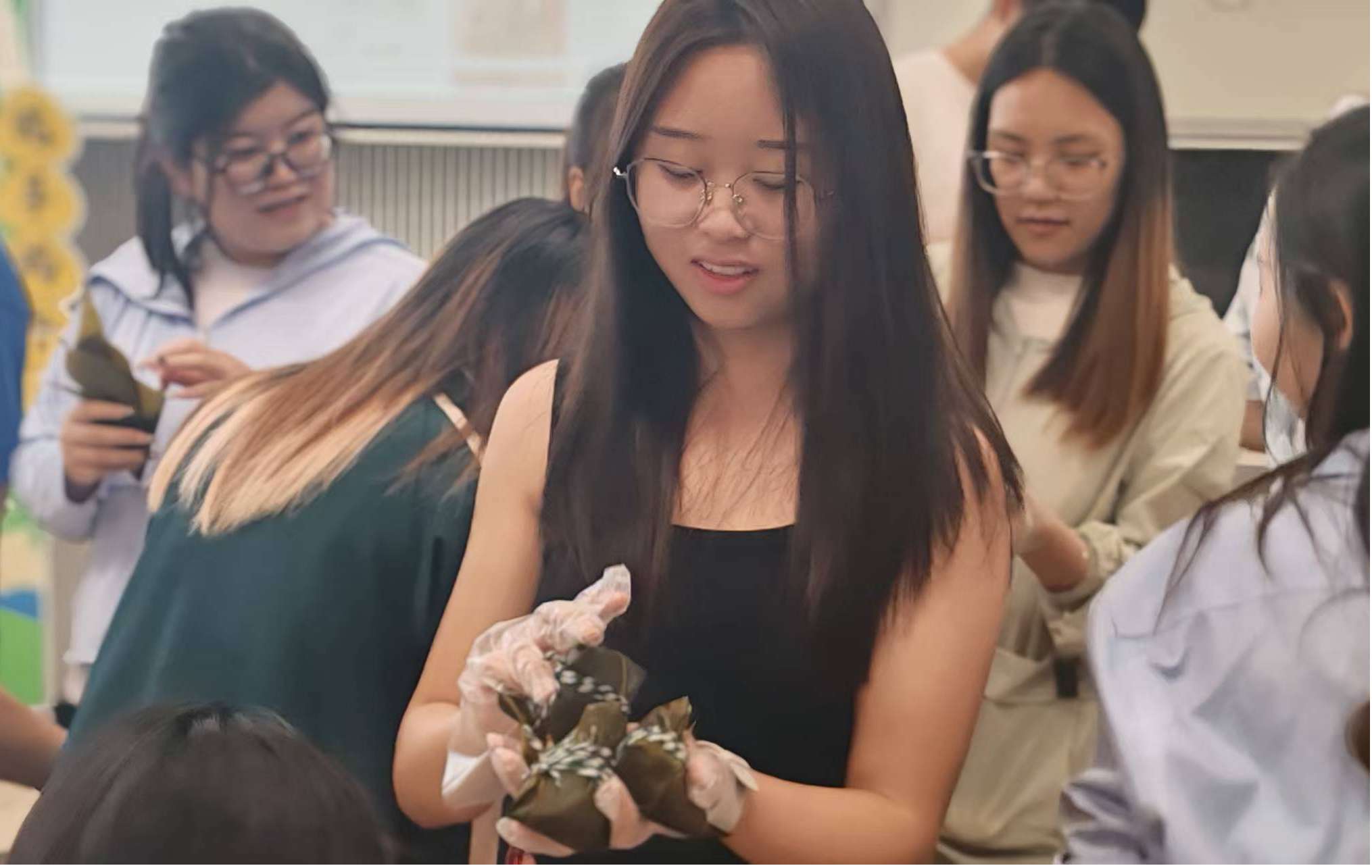 青叶传古韵,素手结安康。活动志愿者将提前准备好的粽叶、糯米、各色馅料以及细绳摆放在教室,同学们根据指引折叶、填米、捆扎,形态各异的粽子在略显生疏又充满热情的手中诞生,迅速将现场的欢乐氛围推至高潮。