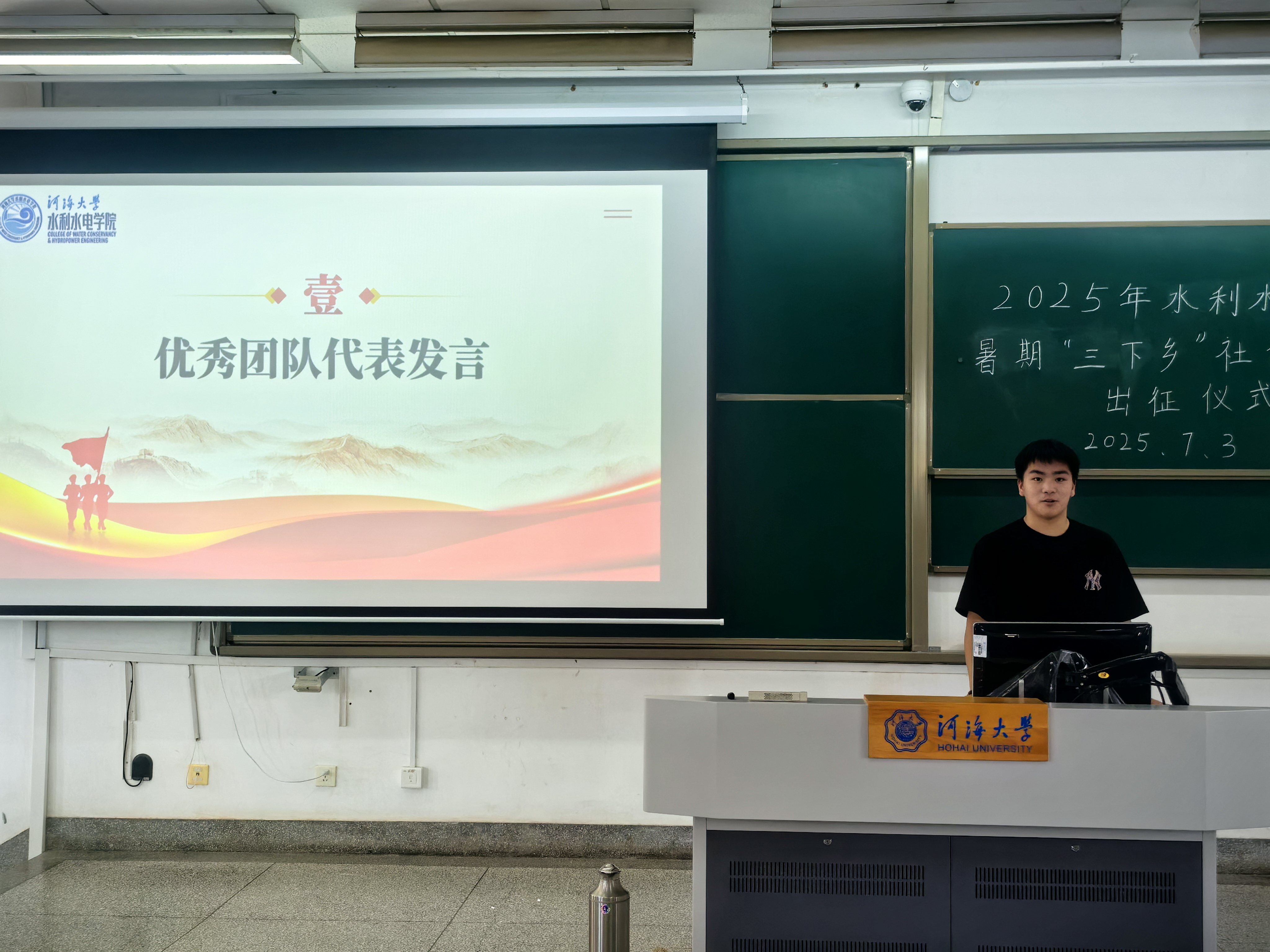 优秀团队代表成昊泽讲述了自己对本次 “三下乡“暑期实践活动的理解与感受:本次实践不仅是一次锻炼自我的机会,更是传承和弘扬河海水电精神的契机。实践活动应紧密结合水利特色,以实际行动为河海大学110周年校庆献礼,并号召团队成员在实践中互帮互助,培养合作能力与创新精神,展现河海水电学子风采。