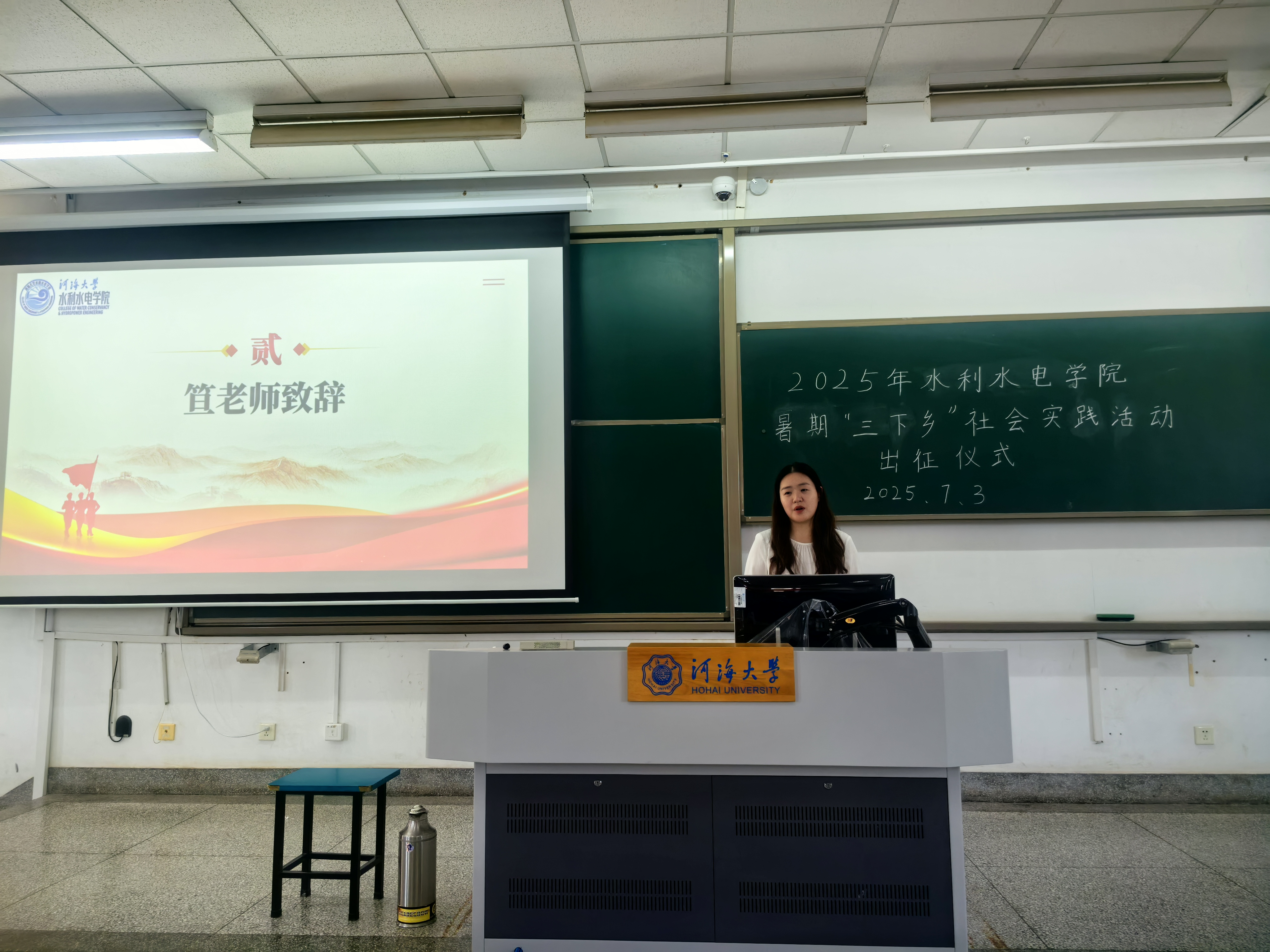 笪步源老师对校、院级成功立项的团队们表示祝贺,也对即将开展暑期实践的同学们提出三点要求。一是强调实践要求,希望各团队在实践中遵守各项规定,筑牢风险危机意识,做好安全保障;将理论与实践结合,发扬团队协作精神,以饱满的热情投入实践。二是明确实践重点,各团队需凝练“五个一”成果,高质量开展“水young江河”专项实践,围绕顶岗实习、科研攻关、校友走访、工程探源及基地共建扎实开实践。三是号召礼赞百十,积极宣传学校办学历史、育人成果和精神底蕴,讲好河海故事、传递河海声音,以实际行动为学校110周年校庆献礼。