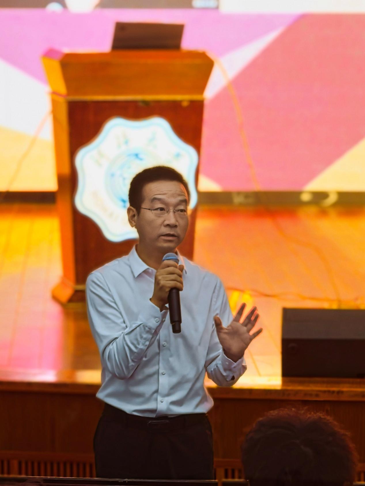 杨志帅校友从自己的求学经历切入,回忆了艰难的来时路,讲述了创业与转型的关键历程。他提到,创业初期聚焦小型农田水利项目时,曾带着团队扎根一线,过着艰苦生活,也因资金短缺、技术磨合等问题多次陷入困境。然而他积极进取,追求突破,始终坚守母校“艰苦朴素、实事求是、严格要求、勇于探索”的校训精神,最终拨开云雾实现自己的创业梦。他深入浅出地阐述了“学以致用”的重要性,并对水利工程领域未来的挑战与机遇做了深入分析。他特别寄语2025级新生,呼吁大家始终牢记校训,把“艰苦朴素”的作风和“实事求是”的态度融入专业学习与未来发展,在水利行业的广阔天地中找准方向、踏实前行。