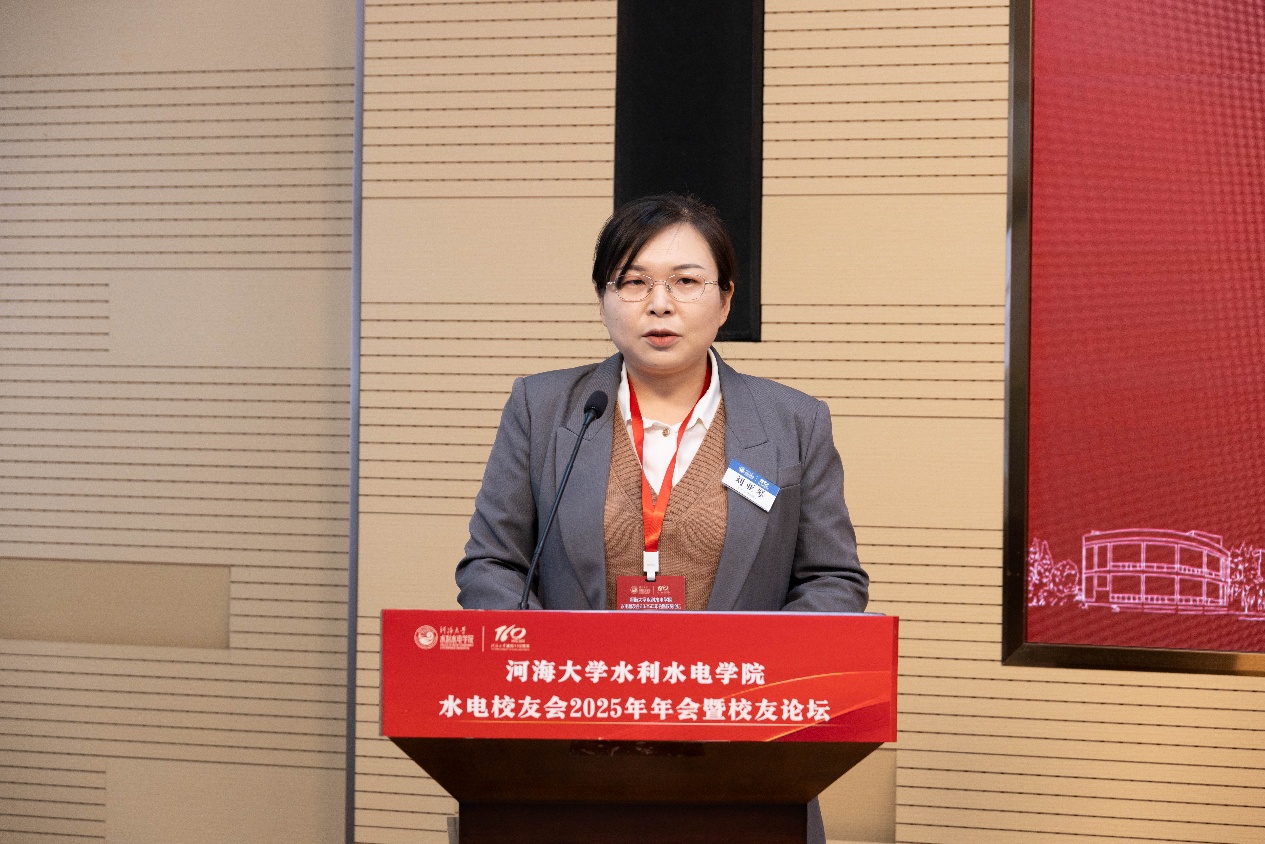 王媛院长首先代表学院向长期以来始终心系母校、支持学校学院建设与发展的各位校友致以最衷心的感谢和最崇高的敬意!她表示,学院始终以"治水兴邦"为己任,紧密围绕国家重大战略需求及世界科技发展前沿,制定学科发展的战略规划,在科技创新、人才培养、国际交流等领域取得了一定的成绩,以争创一流的毅力和意志,不断深化内涵式高质量发展。期盼校友们一是坚守初心,勇担使命,在水利事业发展中再立新功。二是常念母校,情系学院,在产学研合作中深化共赢。三是薪火相传,引领后学,为国家强国建设、民族复兴伟业贡献河海水电人的智慧和力量。