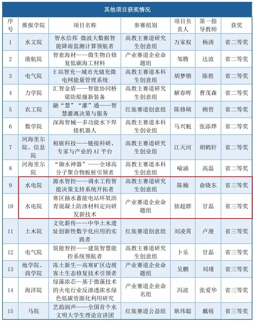 由色漫 推报,甘磊、戴媛媛、徐力群、张长征、顾昊指导,孙一清、张慧美、徐刚、徐超群、张延贺、边虹源、倪勇、李依珊、杨卓、裴亮、郑锴浩、彭诗涵、喻涵、韦庆武、杨子涵同学共同完成的高教主赛道研究生创业组《氧清蓄锐——全球首创抽蓄工程环氧沥青防渗材料供应商》获一等奖。项目首创提出“水工环氧沥青定向研发+智能化配比系统”解决方案。针对沥青混凝土在服役过程中痛点问题,研发核心产品,配套智慧化材料配比系统。产品已应用于多座抽水蓄能电站,与多家公司签订合作协议。