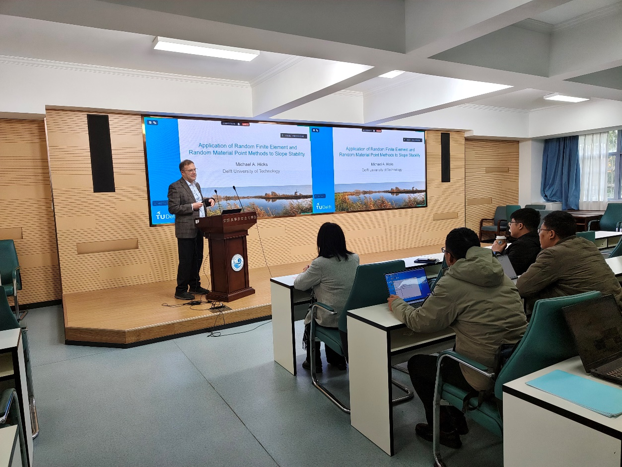 Michael Hicks教授聚焦土体空间变异性对边坡稳定性的影响,系统介绍了基于蒙特卡洛框架的随机有限元法的堤坝等基础设施边坡的二维、三维建模方法,并结合两个区域堤坝案例,阐释了该方法在实际工程中的应用。针对大变形边坡稳定问题,介绍了随机场与物质点法结合形成的随机物质点法,以及在堤坝抗灾能力分析、黏土渐进式滑坡三维演化模拟中的应用潜力。报告结束后,与会师生同Michael Hicks教授进行互动交流,现场学术氛围浓厚。