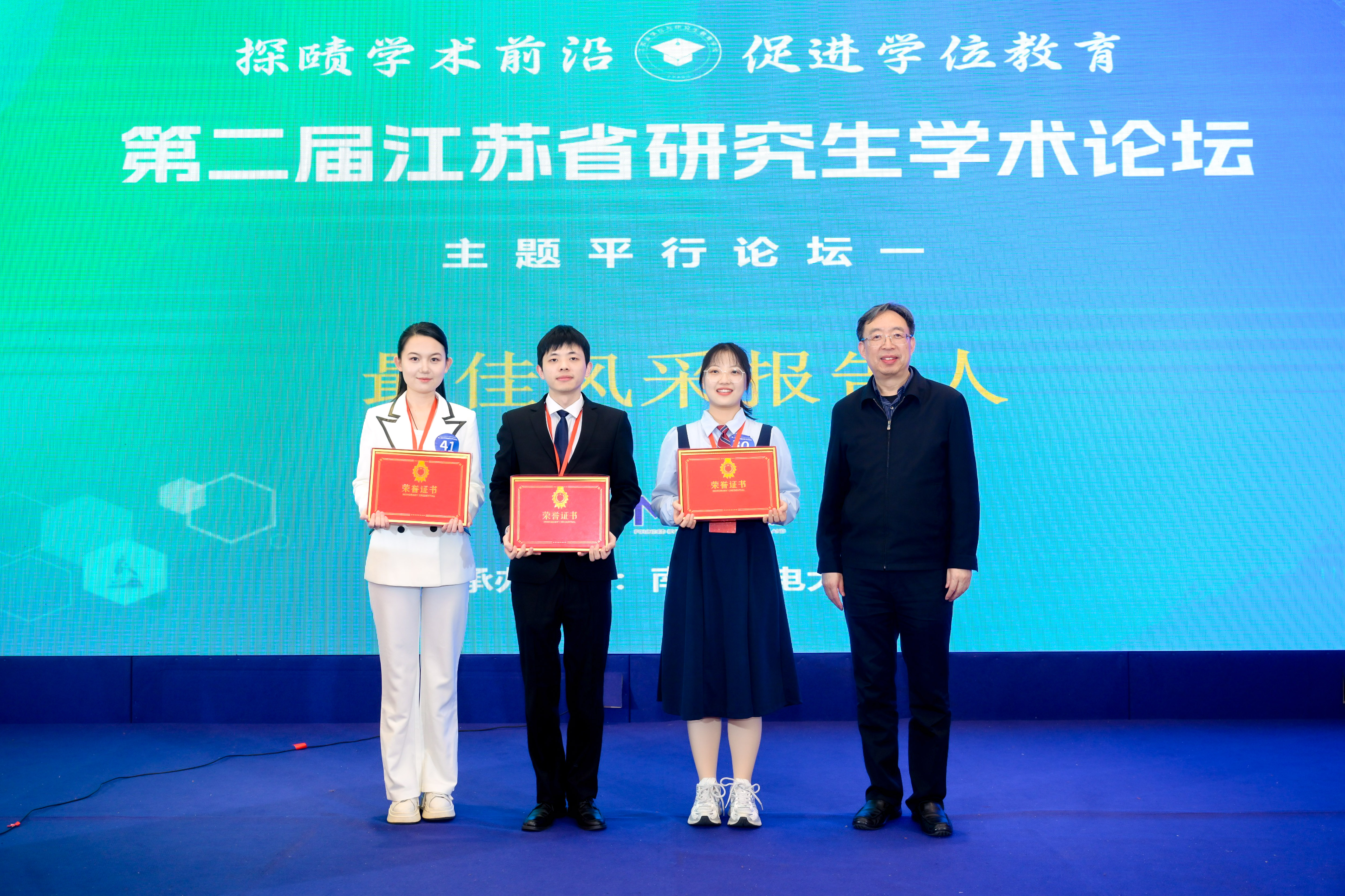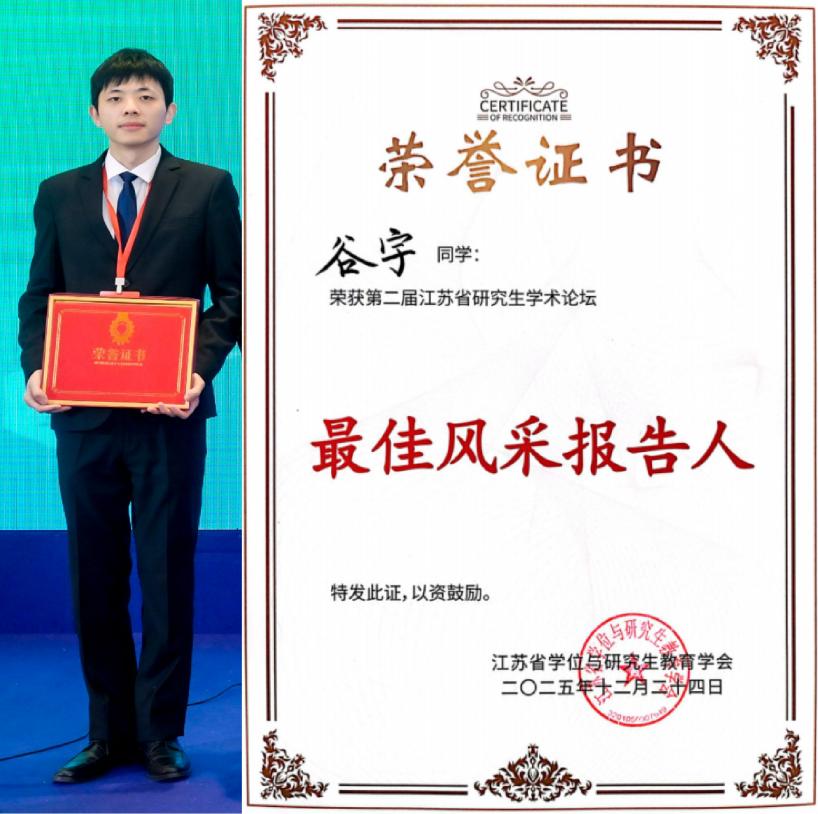 12月24日,第二届江苏省研究生学术论坛在南京成功举办。本届论坛在江苏省教育厅的指导下,由江苏省学位与研究生教育学会主办、南京邮电大学承办,引进了国际学术界通用的“三分钟论文演讲”(3MT)展示模式,强调在极短时间内清晰、生动地阐述科研工作的价值与发现,突出跨学科融合、科研普及与表达能力并重的指导思想。本届论坛由江苏省教育厅原厅长葛道凯、南京邮电大学副校长谢平等多位资深专家担任评委,色漫 谷宇同学代表学校参加论坛并获评“最佳风采报告人”和“优秀学术报告”奖,江苏省教育厅原厅长葛道凯为谷宇同学颁发奖项。