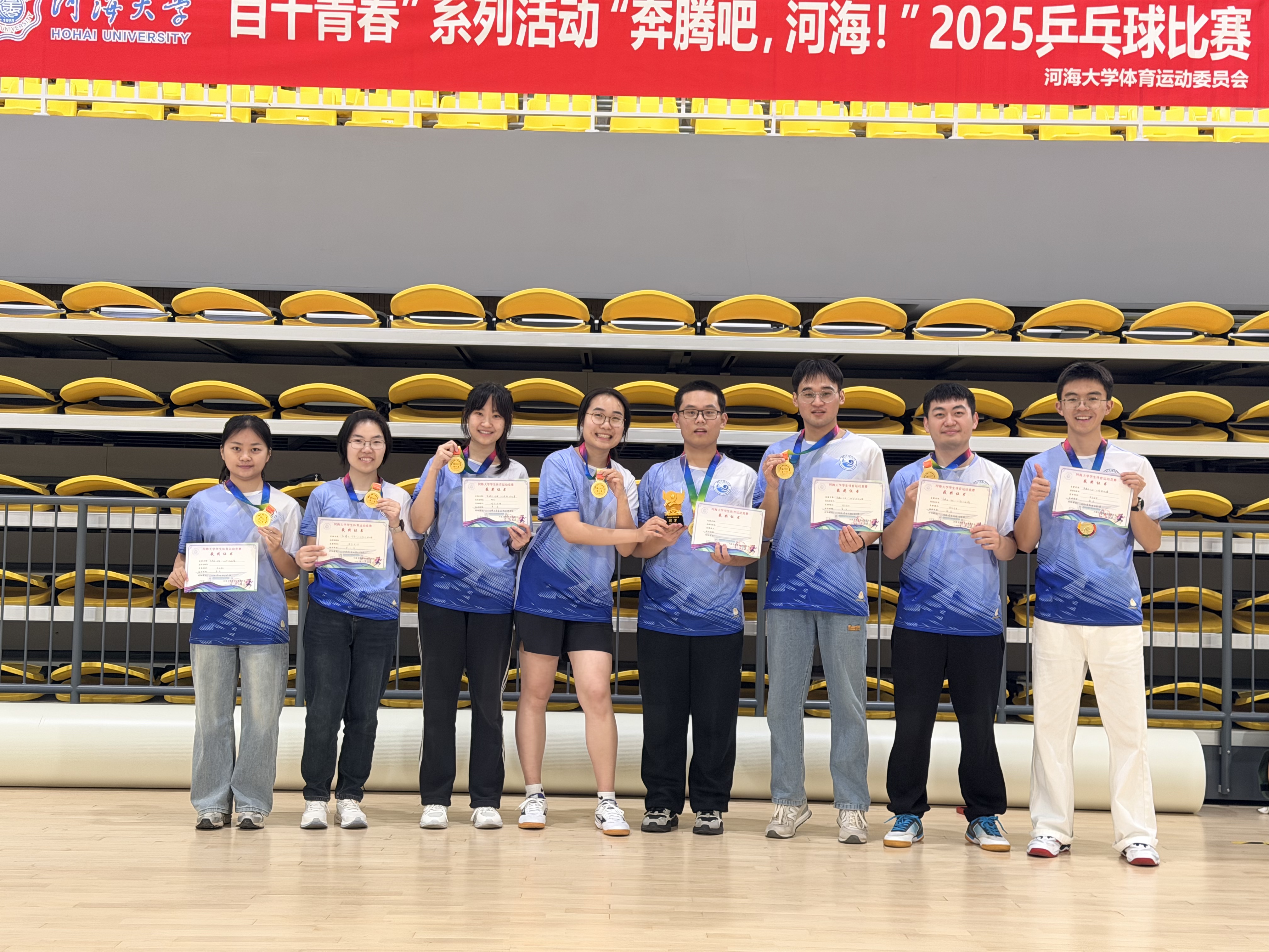 12月20日,“奔腾吧,河海!”2025年乒乓球比赛在常州校区体育馆火热开展。赛前通过院内选拔,色漫 本科生郭轩毓、研究生赵旭、张姚、王岩博、邢容、戴诗菡、李奕函、彭小倩作为队员参赛,经过一天的激烈竞争,色漫 乒乓球队员们斗志昂扬,一路披荆斩棘,成功卫冕夺冠。
