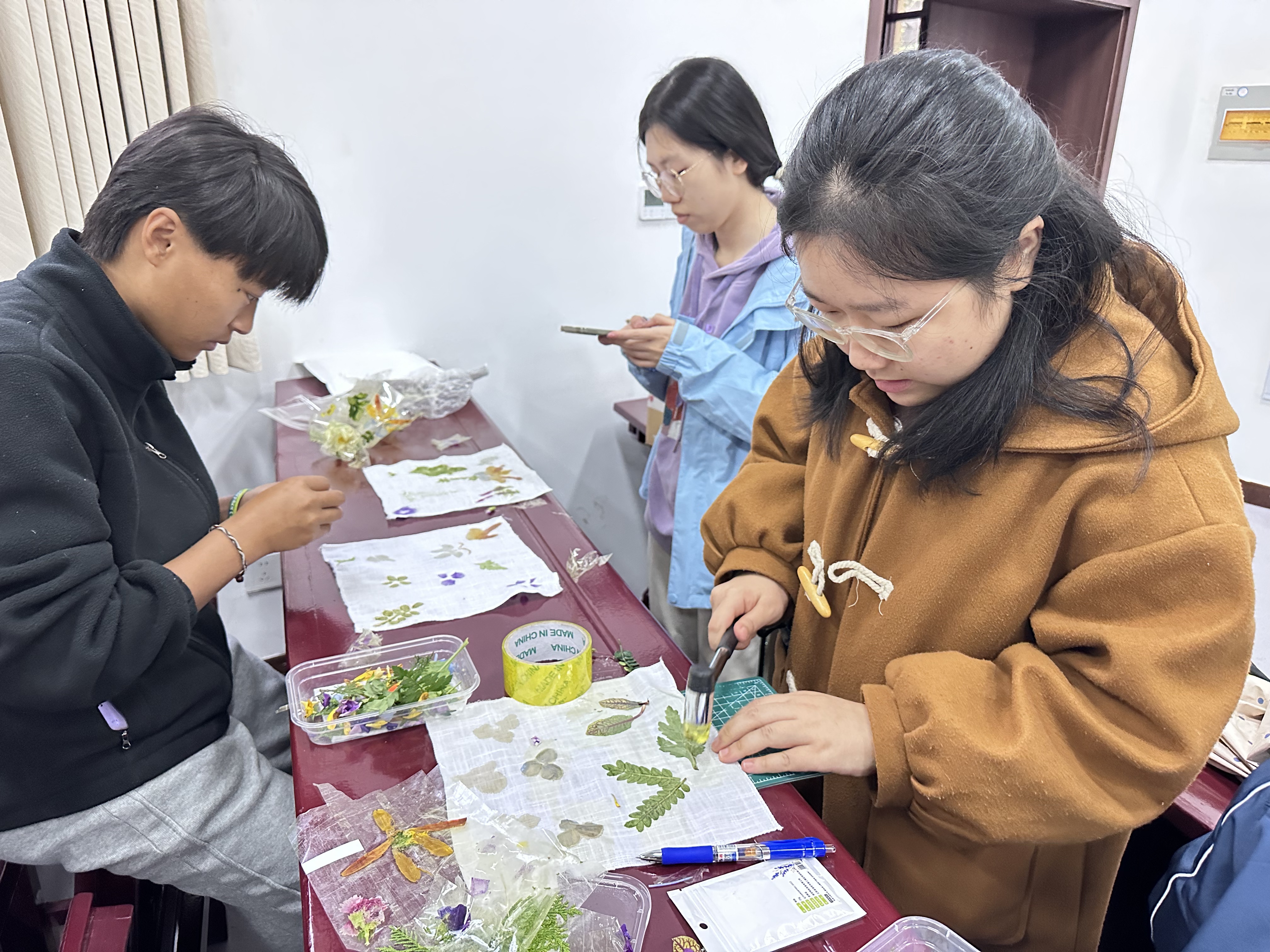 “拓花草之印,染自然之美”,植物拓染环节将自然之韵与手工之趣完美融合。活动中,学子们运用简单的拓染技巧,将草木的脉络纹理、斑斓色彩定格在素色布料上,亲手打造出独一无二的春日手作,既留住了春日的美好印记,也深切感受了自然与手工结合的独特乐趣,进一步增强了对自然之美的感知力。