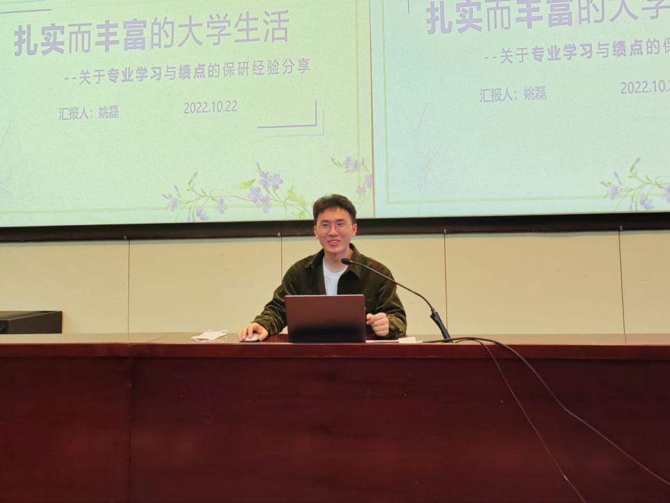 姚磊学长分析了学业成绩对于保研的重要性,提出大一是奠定学习基础的关键阶段。他详细地介绍了大学各种课程的特点并分享了自己的学习资料与学习方法,鼓励新生同学们在丰富自己学习之外的课余生活的同时,要随时绷紧学习的弦。