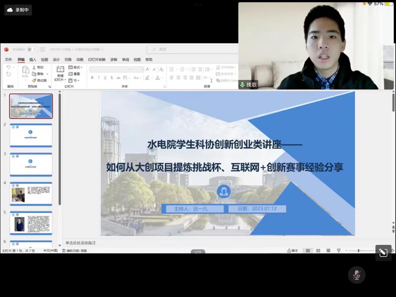 为更好地帮助同学们积极参加“挑战杯”“互联网+”等创新创业赛事,营造浓郁的科创学术氛围,2023年1月12日,我院举办“如何从大创项目提炼挑战杯、互联网+创新赛事经验”专题分享会。院研究生辅导员赵志涵、陈辰,本科生辅导员姜帆、笪步源、侯开智、梁培德参加此次会议。会议主讲人为水电院21级研究生陈楠,港航院19级本科生李昊,会议由学生科协干事吕一凡主持。