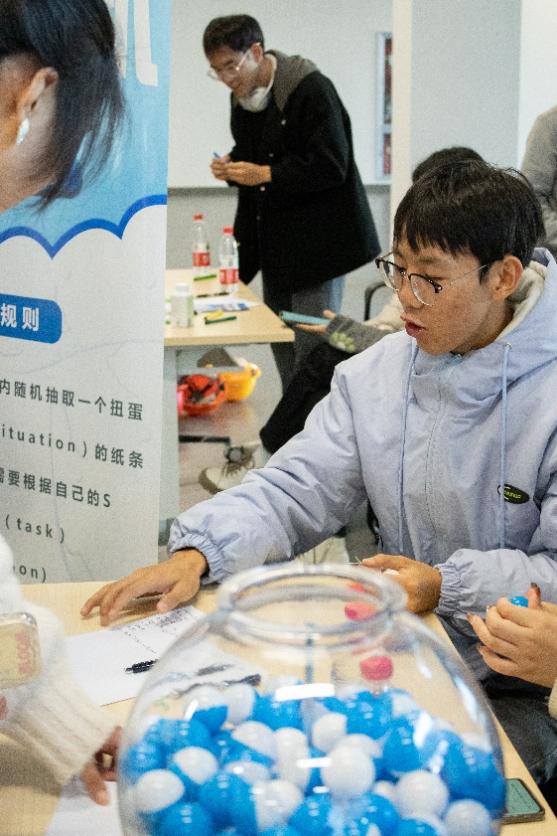 本次活动共分为12个板块,帮助提升同学们各方面的能力:“职业大风吹”的场地上,同学抱团过关,提升了大家随机应变与瞬时判断的能力;“职业猜猜猜”的展位前,大家为猜词配合默契,也提升团队协作能力;“STAR扭蛋机”前,各位同学给出了自己对遇到问题时的应对策略,提升了思维逻辑的缜密性;“面试直播间”更是为同学们提供了一个良好的平台,去介绍自己,展示自己,提升自信;“绕口令挑战”在发掘同学们潜能的同时,也在我们心中埋下“行行行”的种子;“职业风向标”则在一个一个的指令下,提升着同学们的决策能力与瞬时反应……