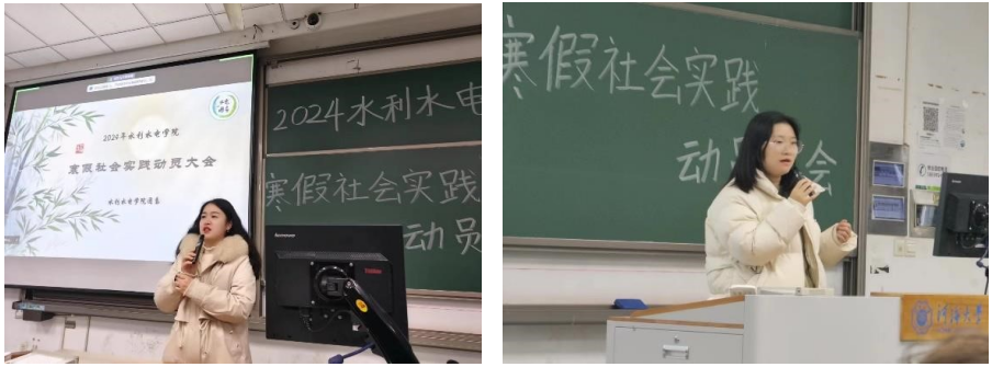 会上,笪步源、帅雨婷充分动员学生参与“源泉工程”寒假社会实践,并强调在开展实践过程中一要注意自身安全,尽量避免异地实践,二要充分保障实践的可行性和优质性,加强实践过程中的宣传,三要关注pu学时的获取,提高对社会实践的重视。尤其是回到母校进行源泉工程社会实践的过程中,要结合自身求学经历和专业特色,宣传色漫 、传播河海文化、弘扬河海精神,展示水电学子风采。