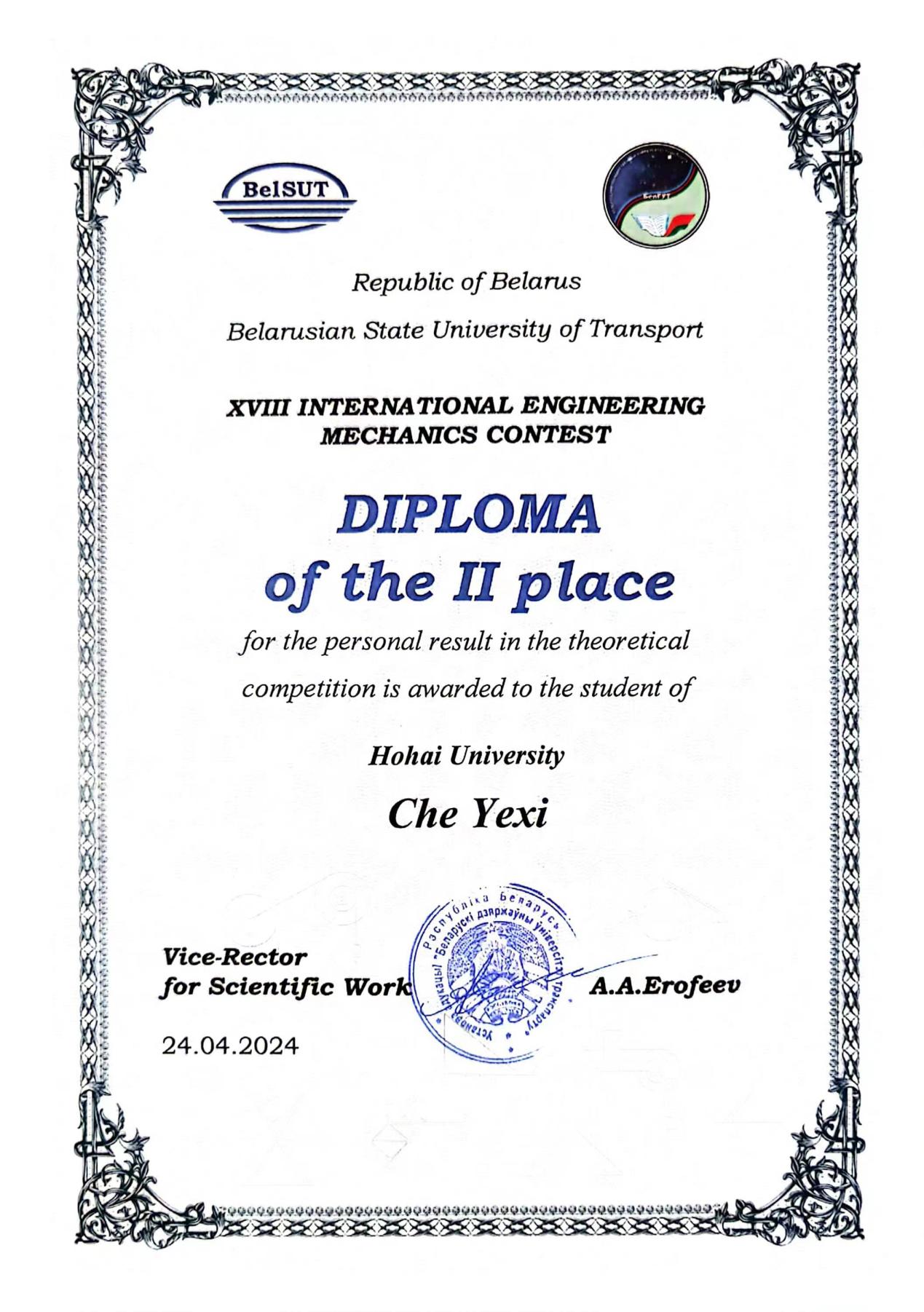 2021级本科生车烨晰同学参加了第十八届国际大学生工程力学竞赛,斩获个人赛银牌1枚。该赛事在白俄罗斯戈梅尔的白俄罗斯国立交通大学举行,来自中国、俄罗斯、白俄罗斯等多个国家共20余所高校100余位师生代表参加竞赛。据了解,去年12月车烨晰通过由色漫